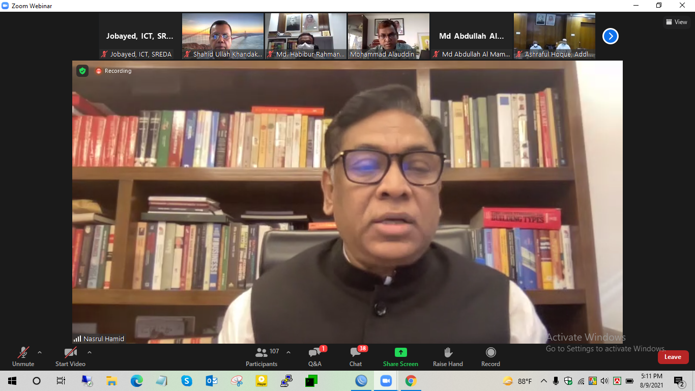 Mr. Nasrul Hamid, MP, Honorable State Minister, Ministry of Power, Energy and Mineral Resources, was the Chief Guest of the workshop. Mr. Md. Shahid Ullah Khandaker, Secretary, Ministry of Housing & Public Works and Mr. Md. Habibur Rahman, Secretary, Power Division were present as Special Guests. Mr. Mohammad Alauddin, Chairman, SREDA chaired the event. Other participants from government and private organizations were also present in the workshop.